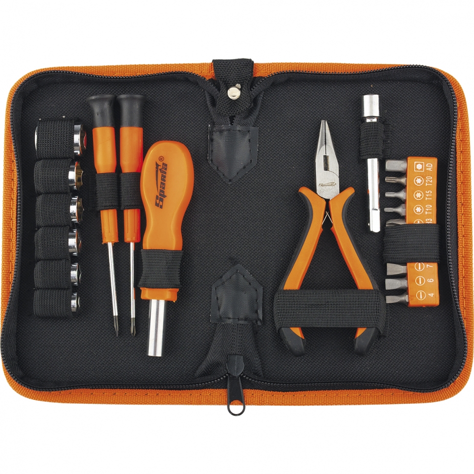 Комплект инструменти, 22 части SPARTA 13537 съдържа 22 предмета. Комплектът се състои от клещи с удължени полукръгли прави челюсти, отвертка, преходник, удължител, две часовникарски отвертки, вложки 8, 9, 10, 11, 12, 13, 14 мм и бити PH 1, PH 2, PZ 1, PZ 2, SL 5, SL 6, T 10, T 15, T 20.
